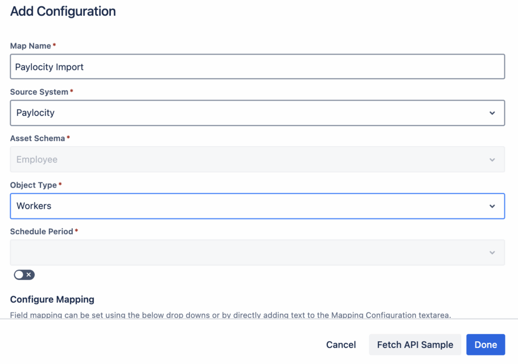 Once connected, you need to define how data maps from Paylocity to your Assets schema.