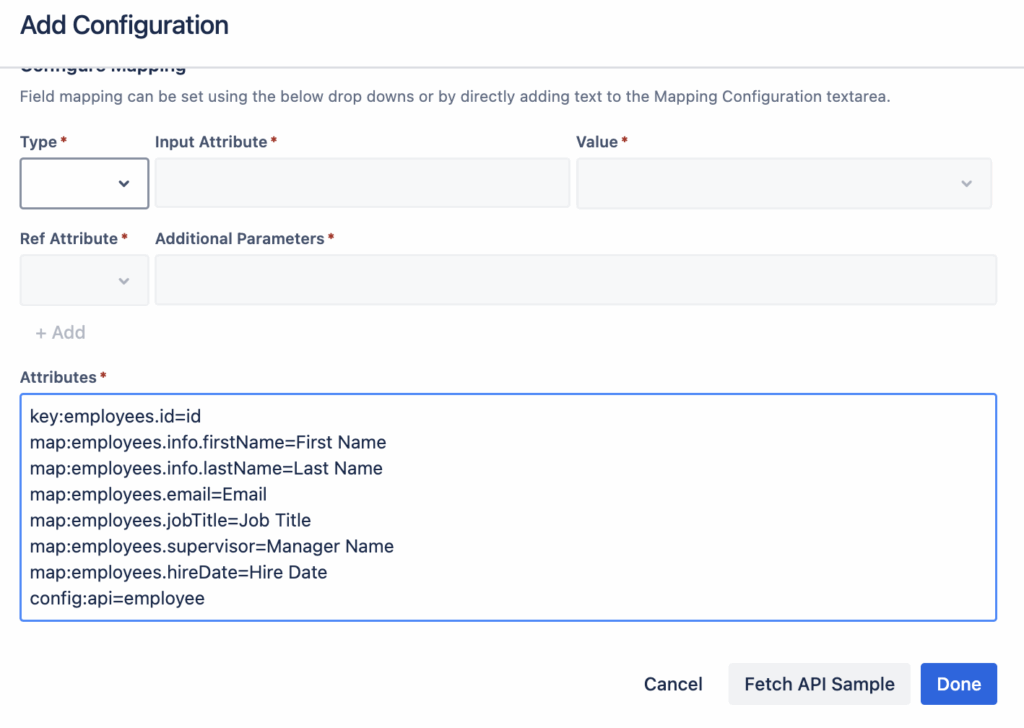 | config:api=employees | Specifies the API endpoint used to pull the list of employees. |
