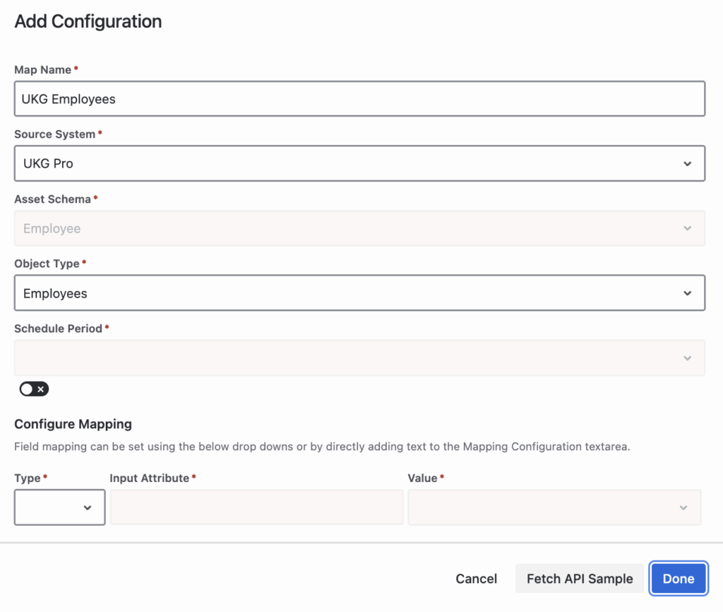OnLink uses a simple configuration format to map UKG API fields to your Assets attributes. Here is a sample configuration to get you started: