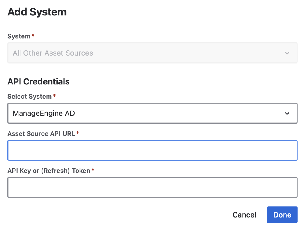 You need the “Auth Token” to set this connection. Choose “All Other Asset Sources” and ManageEngine AD to add this connection. URL should be the base URL of your AD Manager Plus API endpoint.