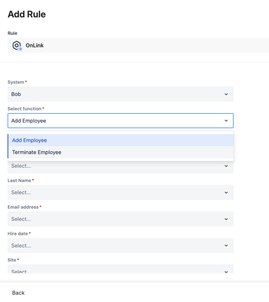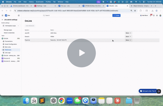 What it does: When specific events occur in Bob e.g a new hire, a termination, a department change, Bob sends a webhook notification to OnLink, which creates a corresponding ticket in JSM.