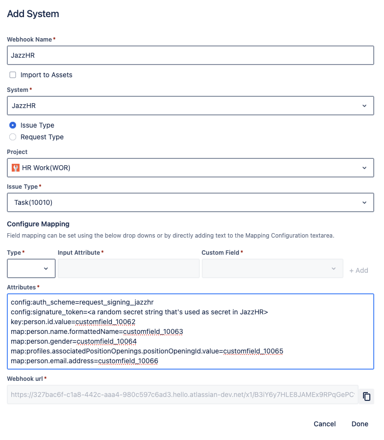 This will generate a unique URL that you will provide to JazzHR. Map the incoming JazzHR fields (like First Name, Last Name, Start Date) to your JSM Request fields.
